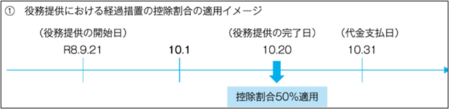 例えばR8.9月に役務提供が開始し、10月に終了した場合は、10月に役務提供の全てが完了したとされ、控除割合50%にて処理します。