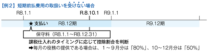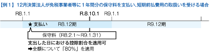 例えば、12月決算法人が、免税事業者等に対して令和8年2月から令和9年1月までの保守料金を令和8年2月中に支払い、これを短期前払費用として処理する場合、保守料金に係る仕入税額相当額の全額について「80%」の割合によって控除することができます。
